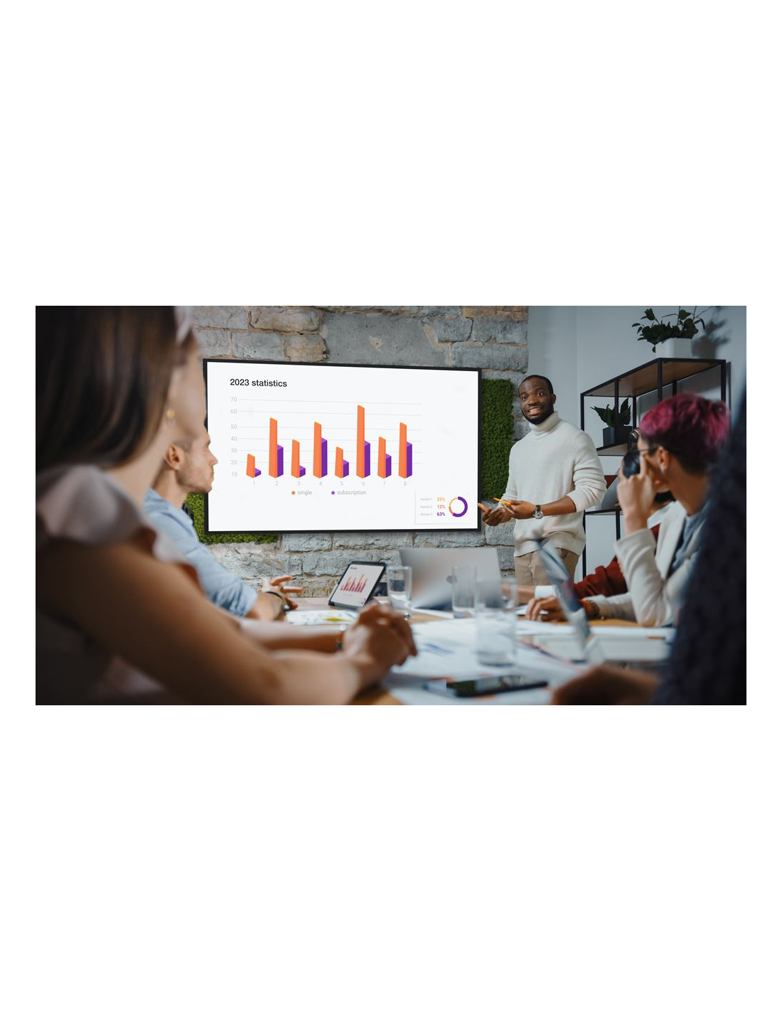 Pantalla premium con brillo superior, filtro de baja luz azul y tecnología sin parpadeos Software exclusivo Whiteboard y Display Share, y apps integradas para compartir archivos y gestionar dispositivos Optimizada para soluciones de conferencia como cámaras web, altavoces Bluetooth y carros motorizados Admite orientación vertical y horizontal.